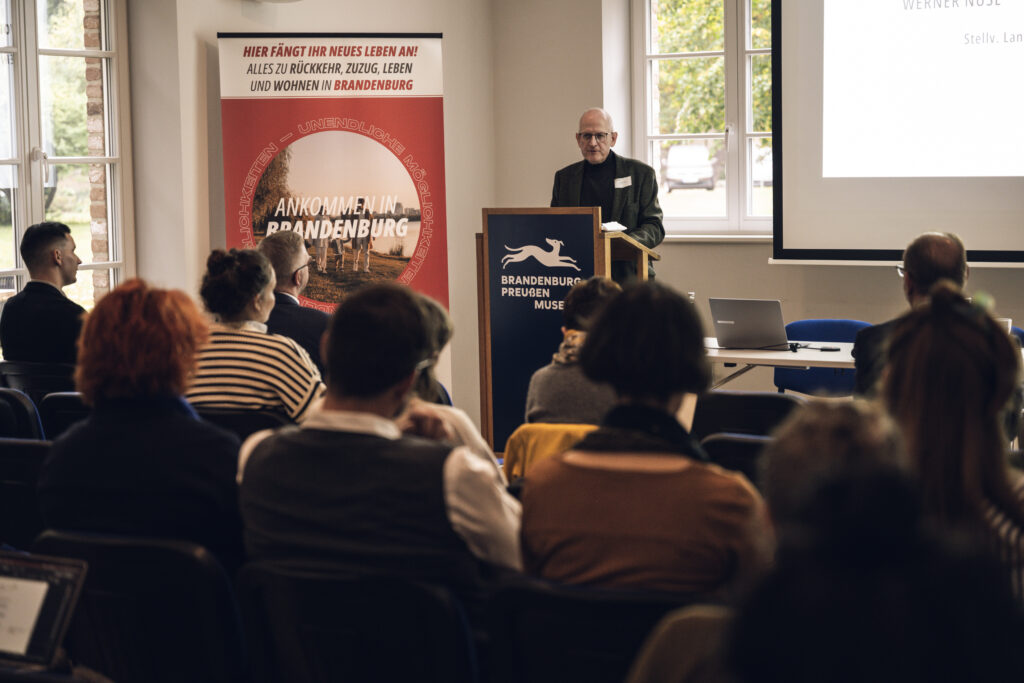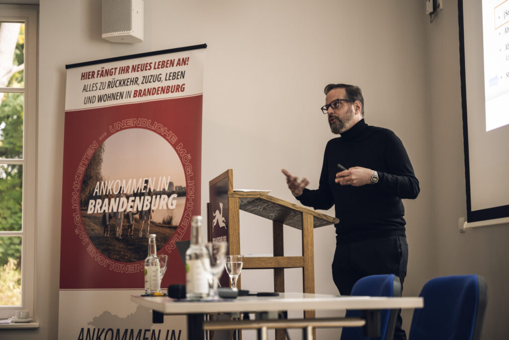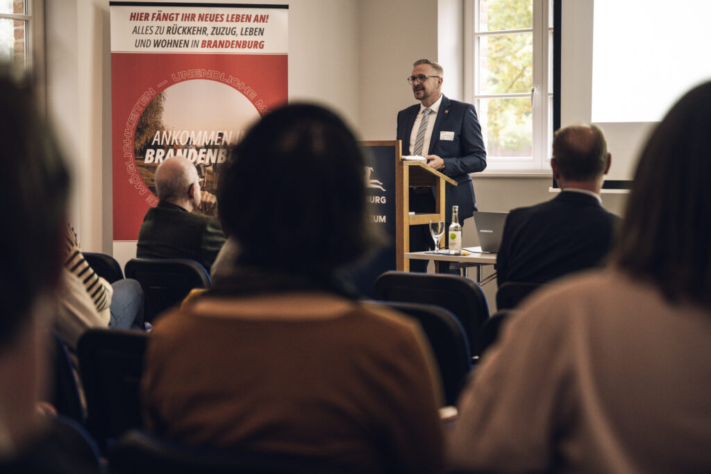 Auch Michael Brentrup, Abteilungsleiter für Regionalentwicklung in der Staatskanzlei Brandenburg, richtete ein Grußwort an die Teilnehmenden. Er bezeichnete den Zuzug als Schlüsselfunktion für die Zukunftsfähigkeit der Regionen und hob hervor, dass das Ehrenamt das Fundament unseres Zusammenwachsens bilde.